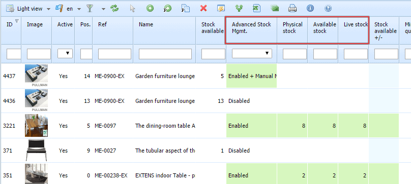 Once the Advanced Stock option is enabled in PrestaShop backoffice, new columns are added to Store Commander's interface: