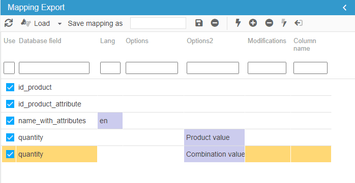 In the mapping panel, the column called 'Options2' includes various options allowing you to decide whether you want to export product or combination information.