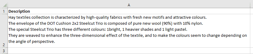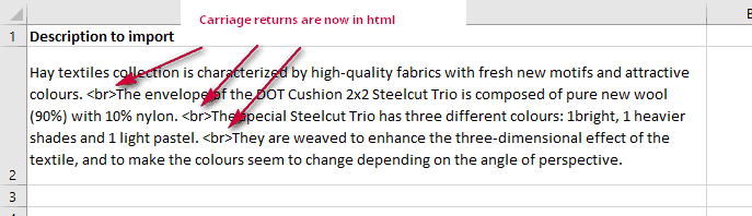 Descriptions can be entered in plain text or in HTML format. But if carriage returns are used in plain text, you will then need to use an Excel formula to remove or keep these carriage returns in your descriptions.