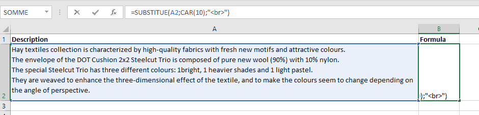 In cell B2, insert the formula =SUBSTITUE(A1;CAR(10);"<br/>")