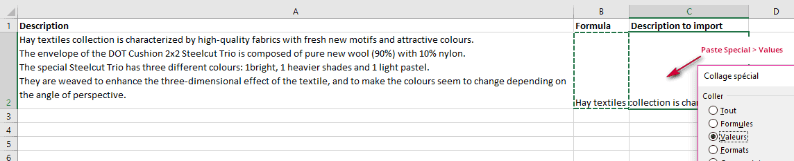 Delete columns A and B. Only keep column C with the converted description that will be imported.