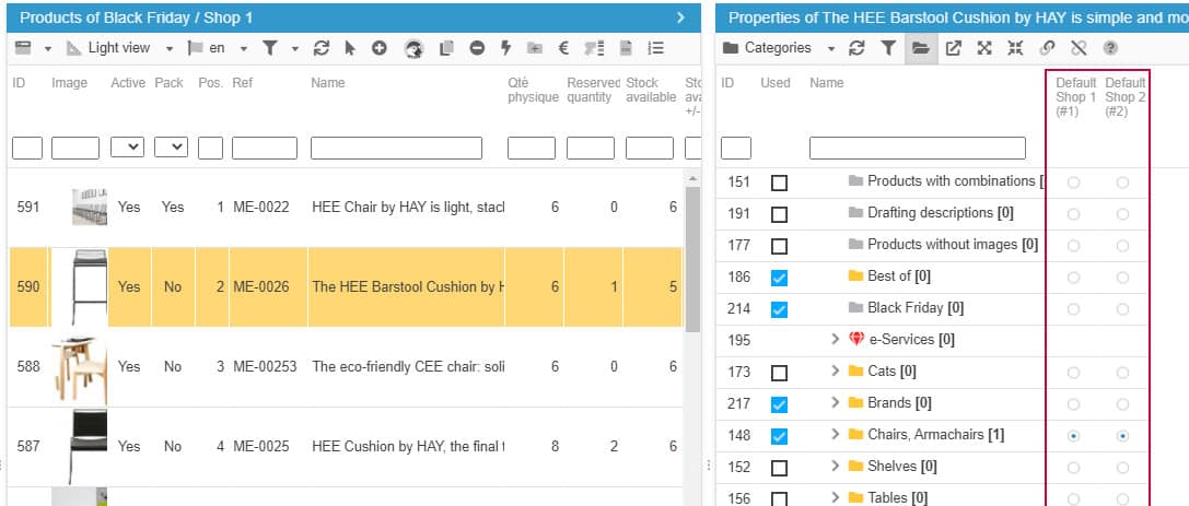 With Store Commander, you to change the default category of your products in a single click, using the Categories panel in the Properties column (right handside).