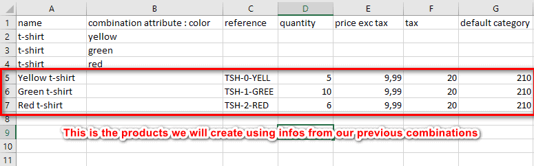 In the column NAME, we create the name of the 3 new products (name + attributes) and drag the other data to the rows of the new names:
