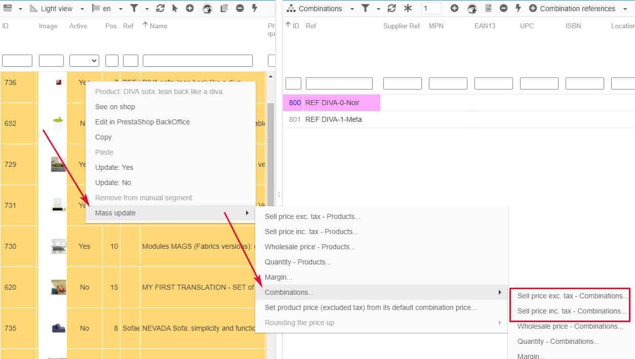 If you need to apply a price modification (increase/decrease) on all combinations of multiple products, you can use the mass-edit option on products.