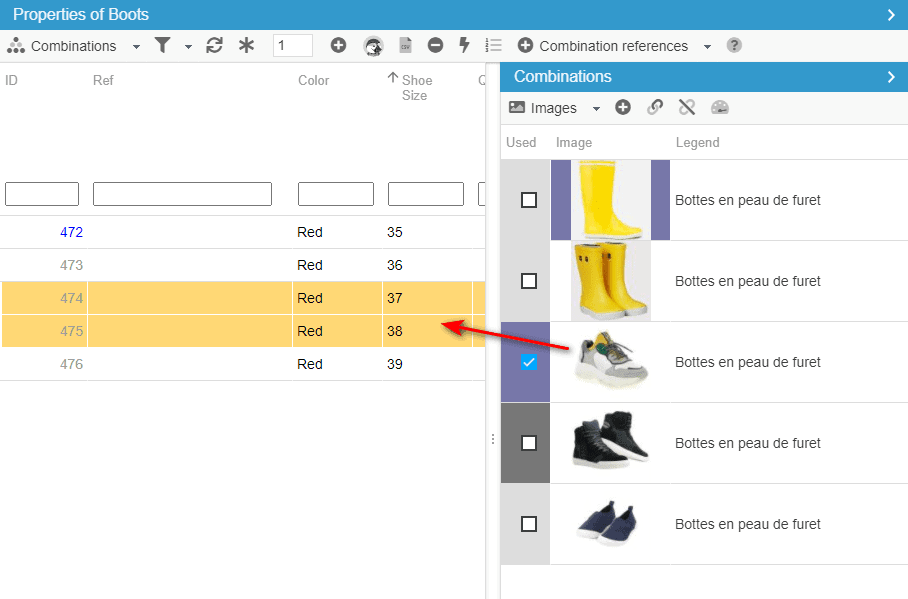 Conversely, you can verify which images are associated to combinations, but clicking the image. Automatically, the associated combinations will be highlighted.