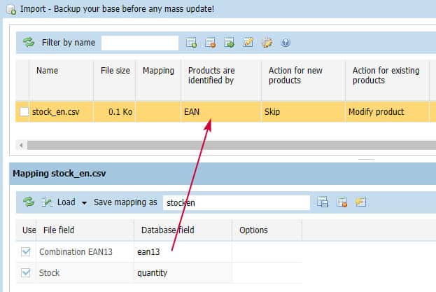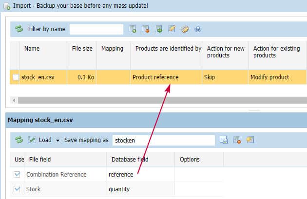 Depending on the identifier you'll chose, here we use the combination reference, below is the example of a CSV configuration in the CSV import window: