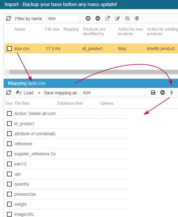The column titles of your csv file are automatically displayed in the mapping panel. Click on the last icon