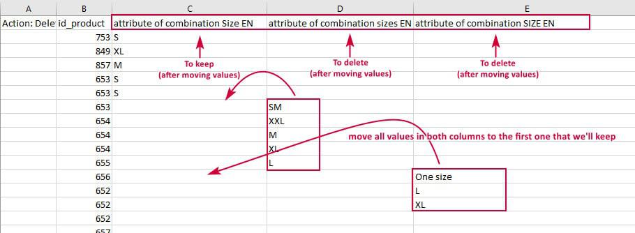 Once the file is exported, you will have 1 line per combination, with 1 column per attribute group: Size, sizes, SIZE.