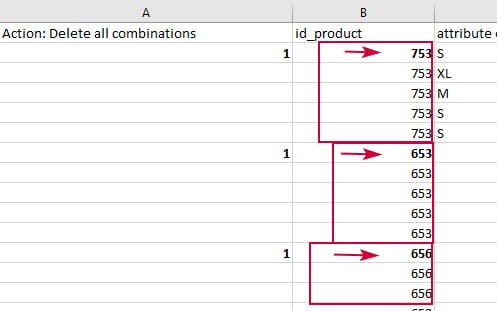Then, in the very first column called 'Action: Delete all Combinations', insert 1 on all lines corresponding to a new id_product, like this: