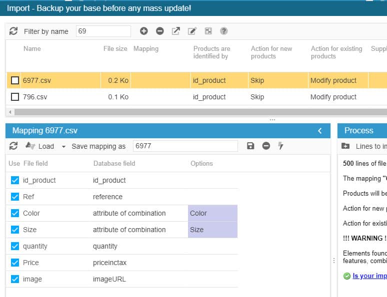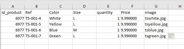 Taking the example of a TShirt using ID 6977, I want to create color and size combinations, as well as reference, price, quantities and images, and my csv file will be: