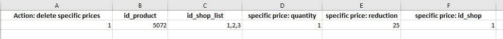 Below, we delete all specific prices on product ID 5072 in ID shops 1, 2, 3, and we then create a new specific price (25€ discount) in ID shop 1 only.