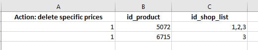 In the below example, we delete all specific prices on product ID 5072 in ID shops 1, 2,3, and on product ID 6715 only in ID shop 3.