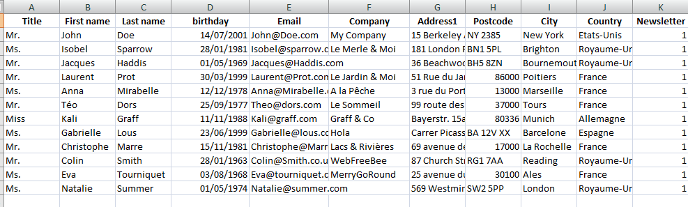 Then, a line represents a customer and his/her properties, such as title, first name, last name, address, company, customer group, etc.