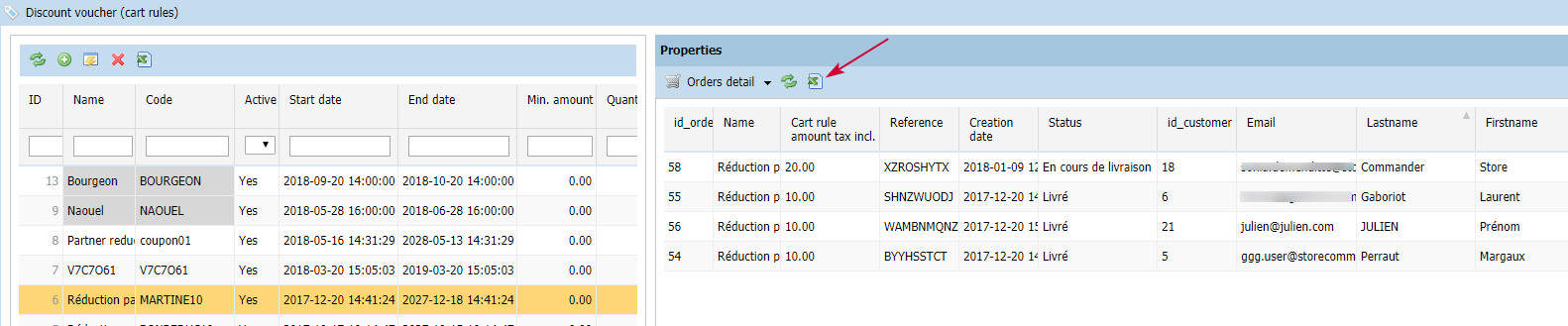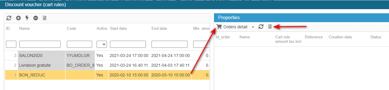 On the right handside column, open the Order details panel to display the list of customers and their orders that used the selected discount voucher.