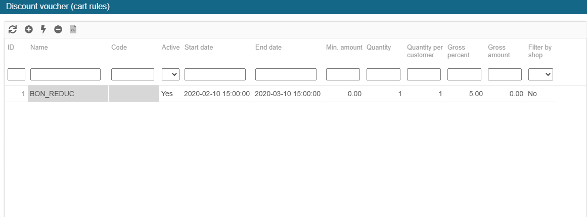 In this window, you can see the details of all cart rules you might have created in your PrestaShop backoffice: