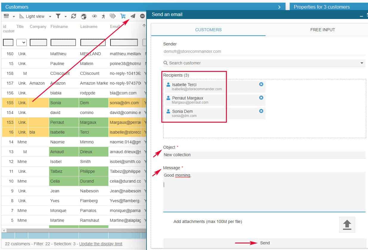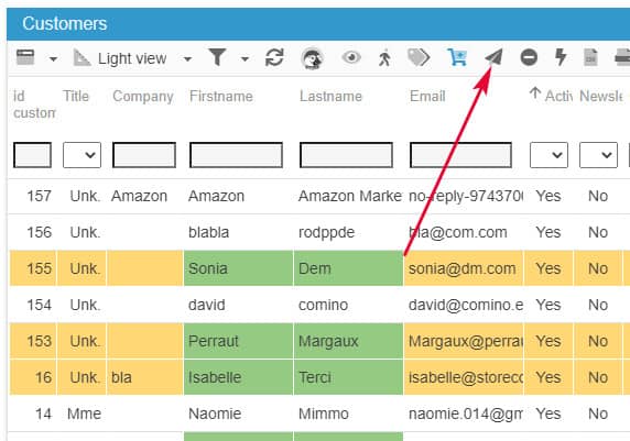 To send an email to a specific customer, select it in the list before clicking the icon.