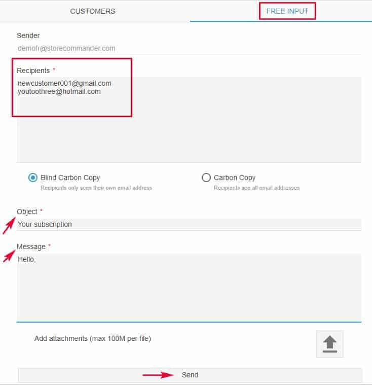 To send a message to one or more persons that are not yet part of your customer base, use the tab 'Free input', to manually enter the corresponding email addresses.
