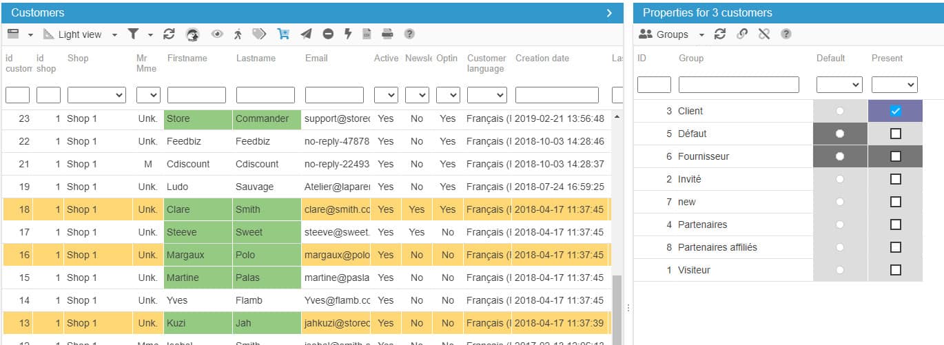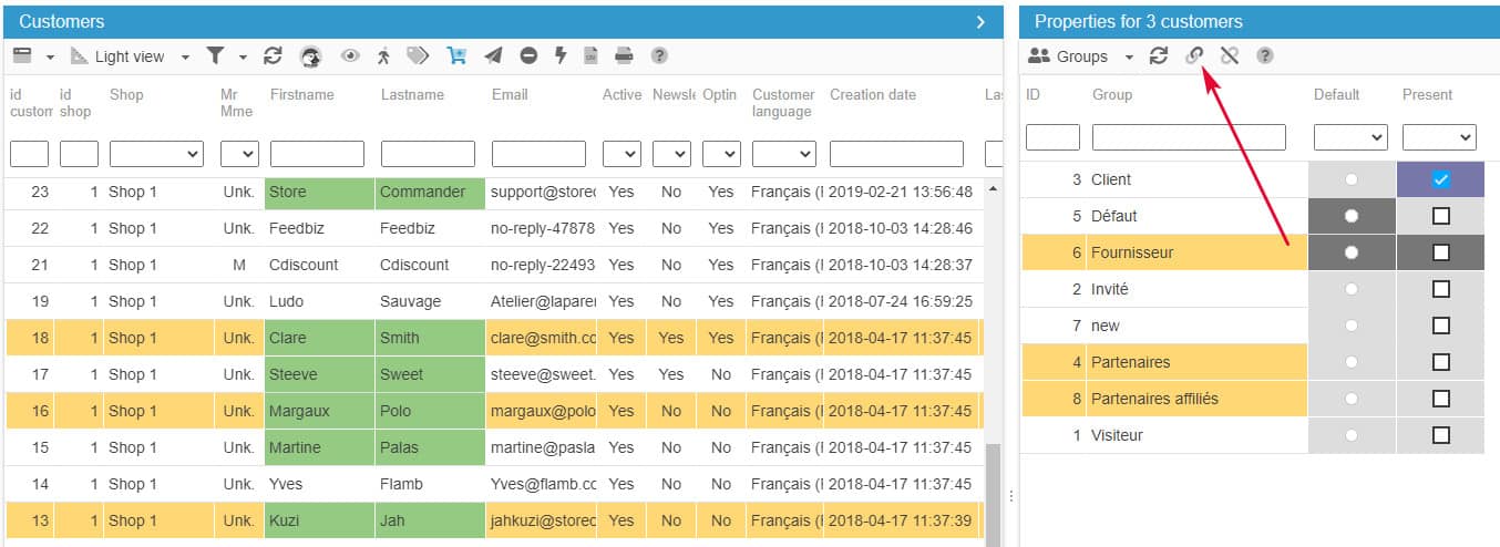 To associate customers to specific customer groups, you can use the 'Groups' panel located in the properties panel, right hand-side colum.