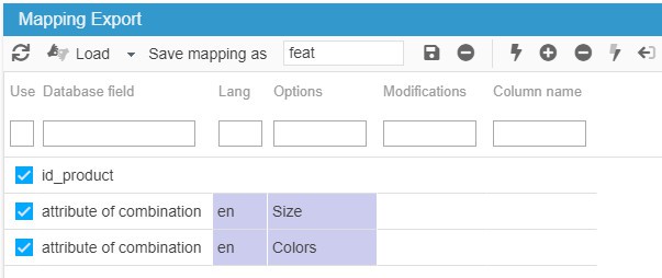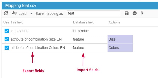 Then, without having to modify the exported file (unless you want to modify some values), import the file, still with Store Commander, mapping the combination attribute fields with the feature fields.