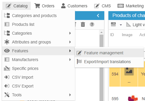 Store Commander's interface includes a panel dedicated to features management, accessible from Catalog > Features.