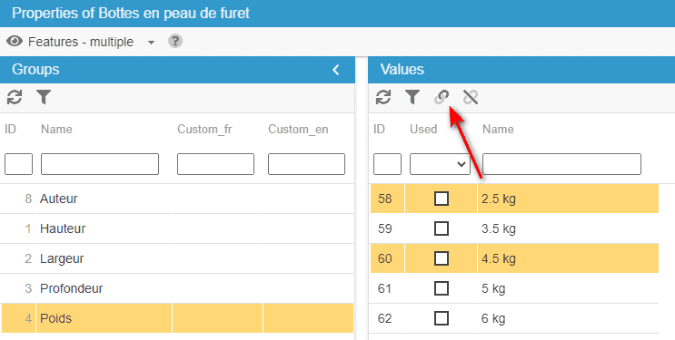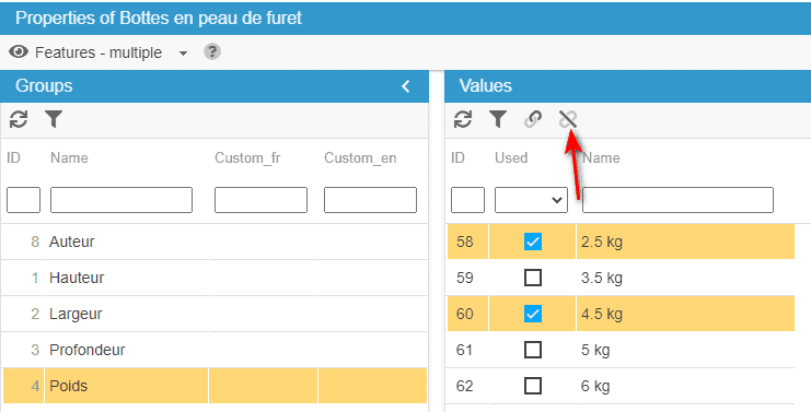 Conversely, you can dissociate features values by unticking the boxes or use the mass-dissociation icon: