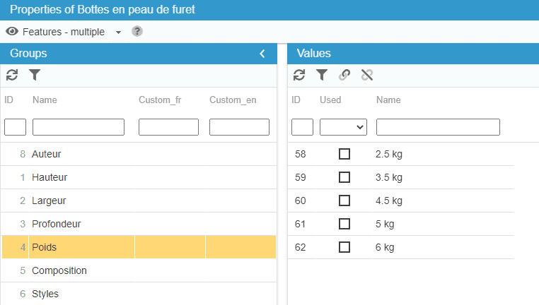 This new menu displays the list of features as well as the list of corresponding values in a second grid :
