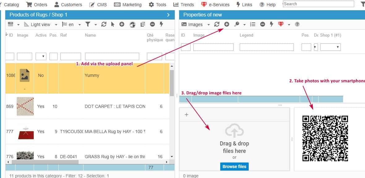 - click on Upload images to add photos to the product: the tedious file transfer is no longer required :)