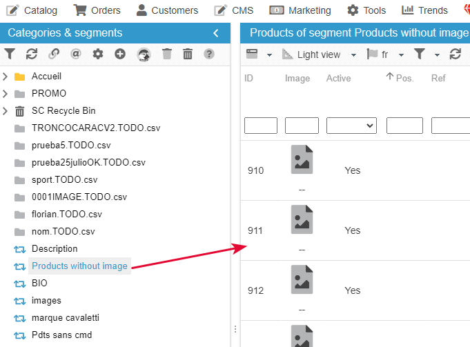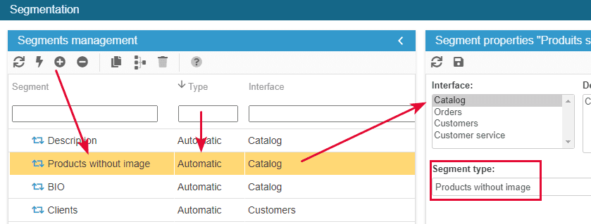 Indeed, the Segmentation tool allows you to create an automatic segment displayed in the Catalog interface with the type 'products with no image'.