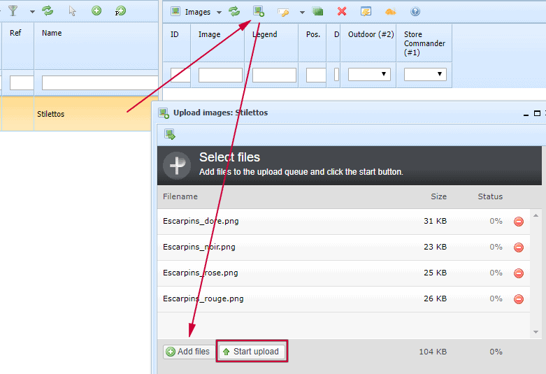 To add one or more images to product(s), first select the product and then hit the add icon  on the toolbar.