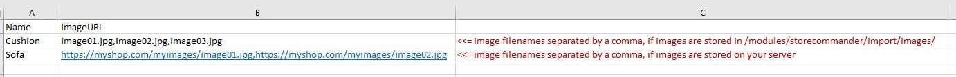 When creating your CSV file, you will need to include a product identifier (name, reference or ID) and a column including the image URLs (see our related article here), comma separated, if the value separator used in your import configuration is also the comma.