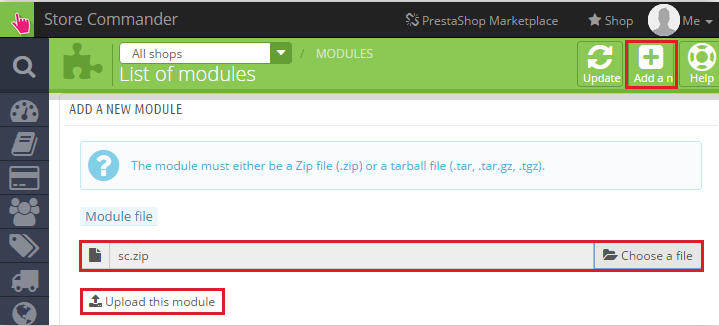 Here are the installation steps for Store Commander module once you downloaded the installation file sc.zip. From PrestaShop backoffice > Modules < click Add a new module, select and upload sc.zip