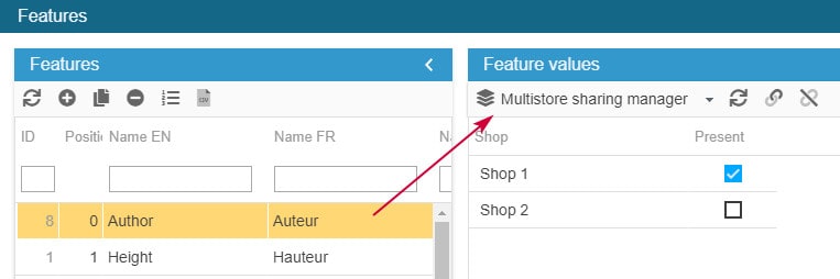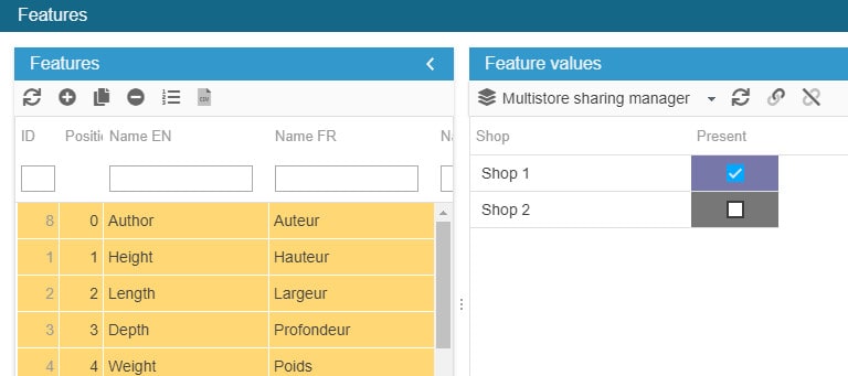 When working in MultiStore mode, PrestaShop allows you to make product features available on specific shops (shop association).