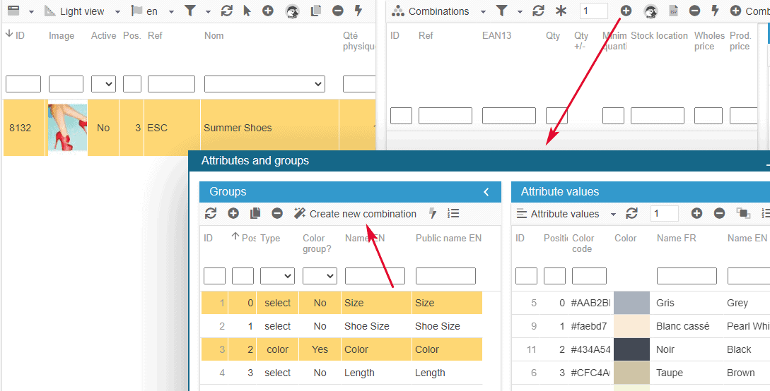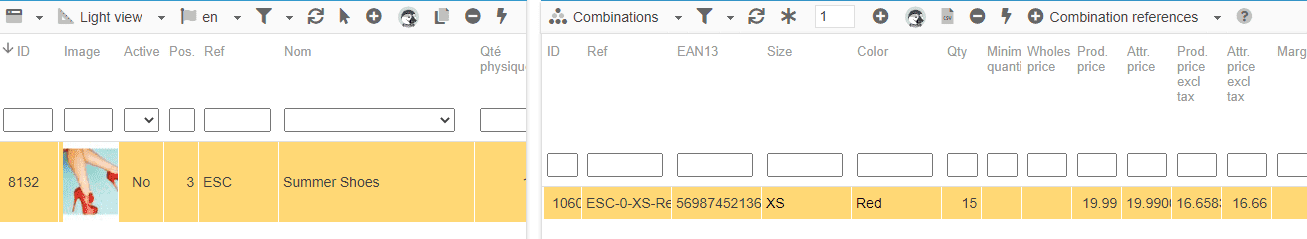Back in the Combinations panel, both Color and Size are now present in the grid and the line of the first combination is created.