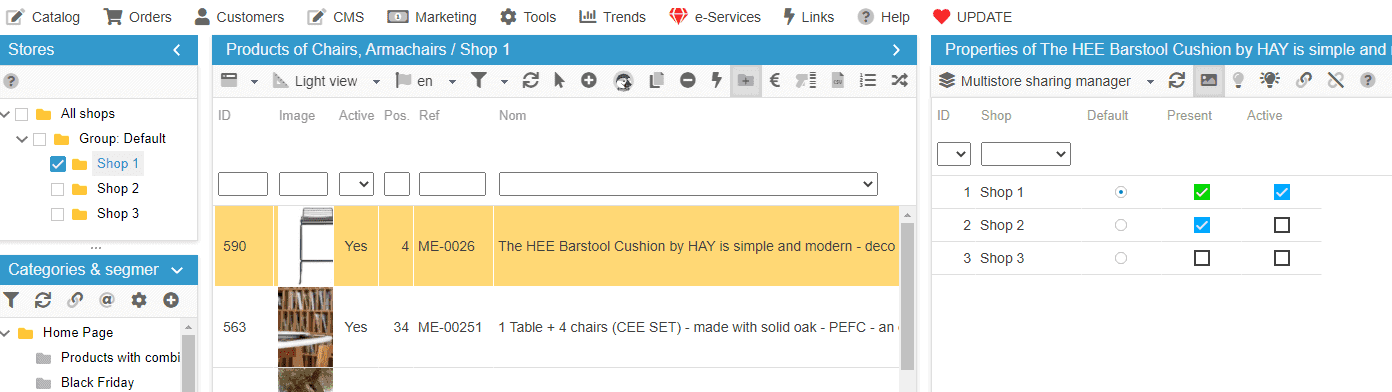 In this panel, you can also visualize if the product is active or not in the associated shops: 'Active' will be ticked/unticked