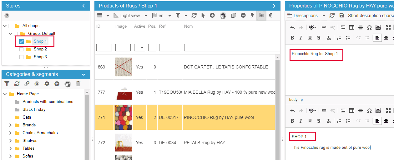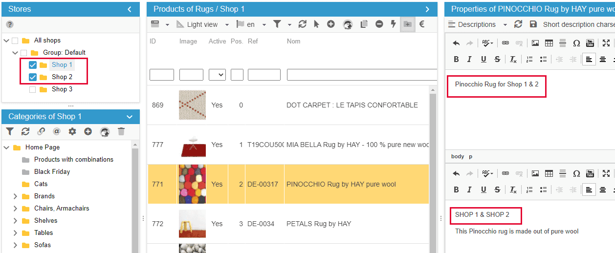 When a product exists in multiple shops, you can set a description specific to each shop, or the same for multiple shops.