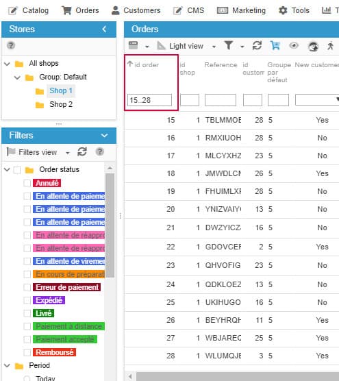 The filtering tool within the Order interface in Sc, specifically for id_order column, can be used to display a range of orders by entering specific operators.