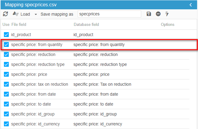 Note that the column 'Minimum quantity' ('from quantity') is necessary.The available database fields are: