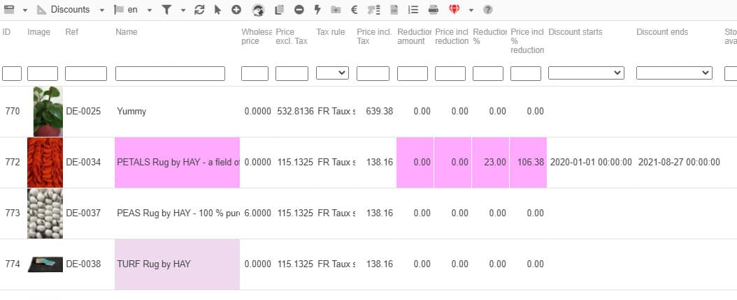 For a fast visual identification of your products with a reduced price in the Discounts view, Store Commander uses 2 colors: light and dark purple.