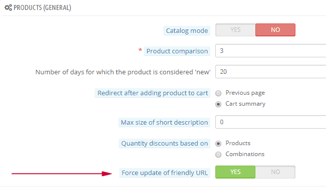 For PrestaShop version 1.6.x, this option has been removed from Store Commander because it now exists in PrestaShop backoffice > Preferences > Products > Force update of friendly URL.