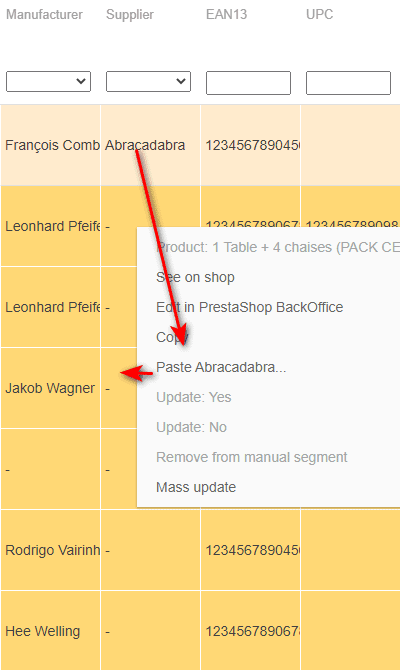 Another example: you can associate a supplier to multiple products. The principle remains the same: you display the products > you associate the supplier to the first product > right click on the supplier name to copy > select all other products > right click to paste.