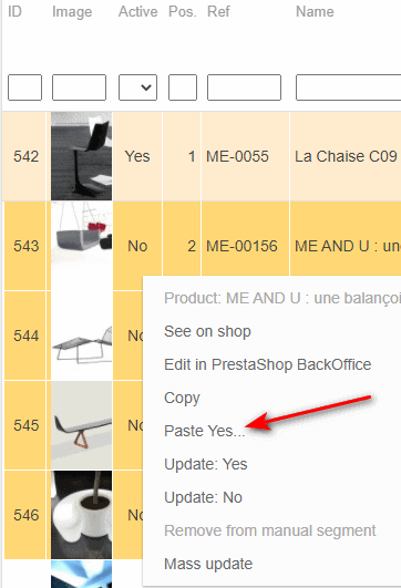 Once the concerned products are displayed in the central column, enable the first product. Then you can right click on 'yes' to then paste onto the other products you would select before hand. This takes just seconds!