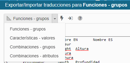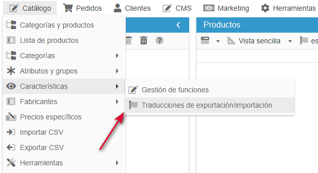 La herramienta es accesible desde el menú Catálogo > Características > Exportar/Importar Traducciones