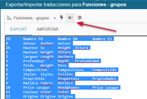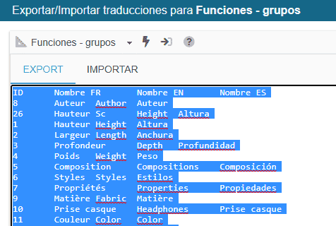 Cuando haya seleccionado los elementos a traducir (grupos/valores), los datos correspondientes en todos los idiomas aparecerán automáticamente en la pestaña "Exportar", y se seleccionarán por defecto.