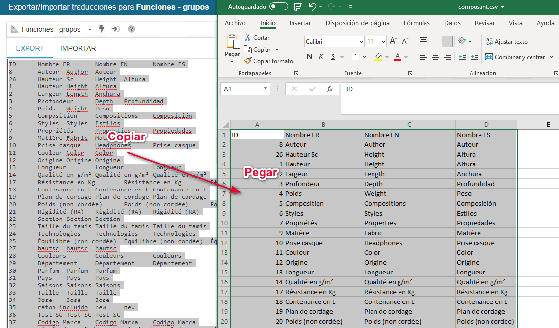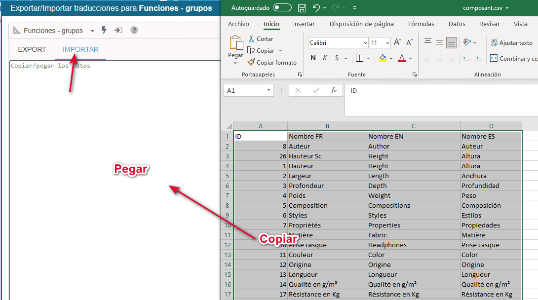 Gracias a la herramienta de exportación/importación dedicada a las características, podrá traducir los nombres de los grupos y los valores de características a todos los idiomas de la tienda muy fácil y rápidamente.