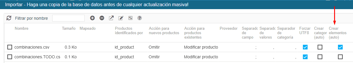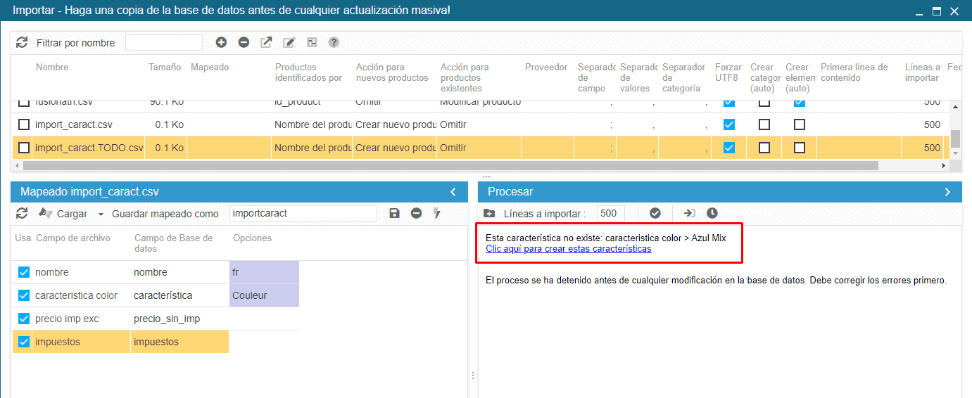 La herramienta de importación csv de Store Commander le permite crear automáticamente nuevos valores de características (indicados en el archivo de importación pero que no existen en la tienda PrestaShop) gracias a la opción 'Crear elemento (auto)'.