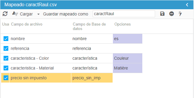 El mapping de import CSV incluye una opción de supresión de características (Acción: suprimir las características del producto) que permite desvincular las características de los productos del archivo CSV antes de la importación de nuevas características.