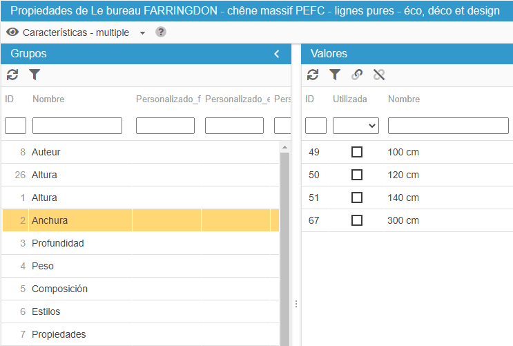 La cuadrícula está formada por dos paneles: los grupos y los valores (correspondientes al grupo seleccionado).