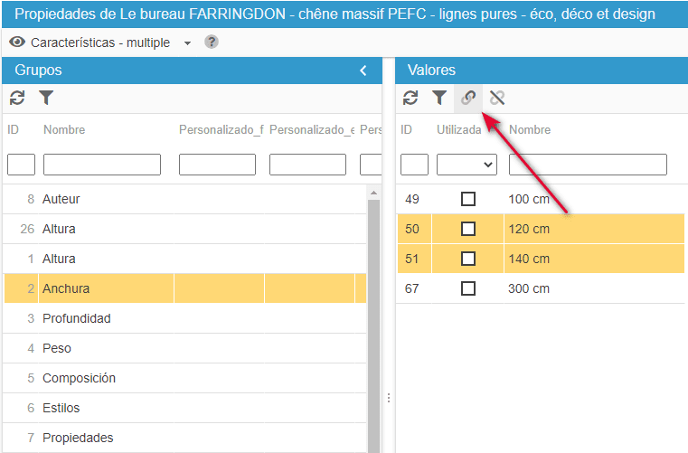 Por el contrario, para desasociar las características, desmarque la(s) casilla(s) de los valores deseados o utilice el icono de desasociación masiva después de haber seleccionado las filas de valores.