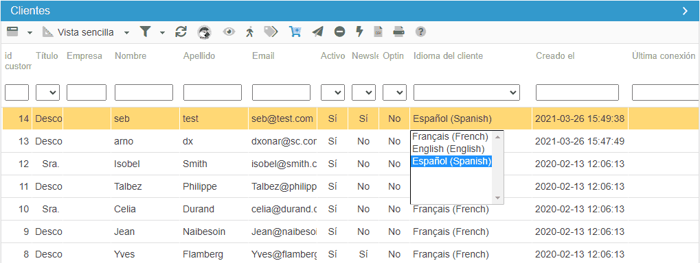 El campo "idioma" de la interface de cliente es editable. Haga doble clic en la celda para seleccionar el idioma deseado.