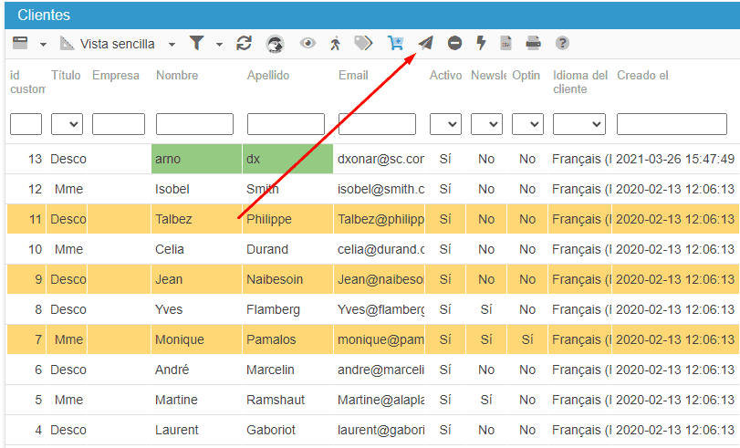 Para enviar un correo electrónico a varios clientes, selecciónelos antes de hacer clic en el icono.